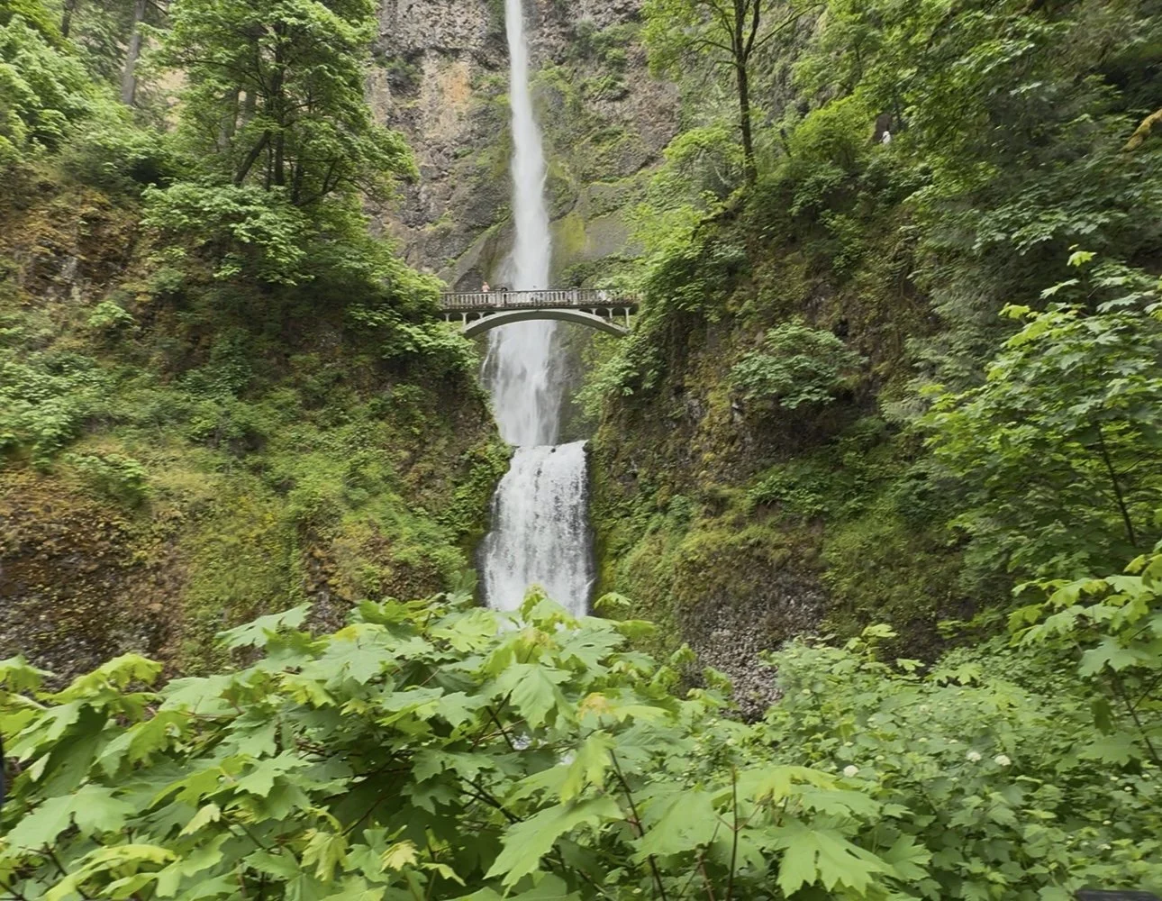Multnomah Falls in a lush green forest with a bridge crossing the middle tier.