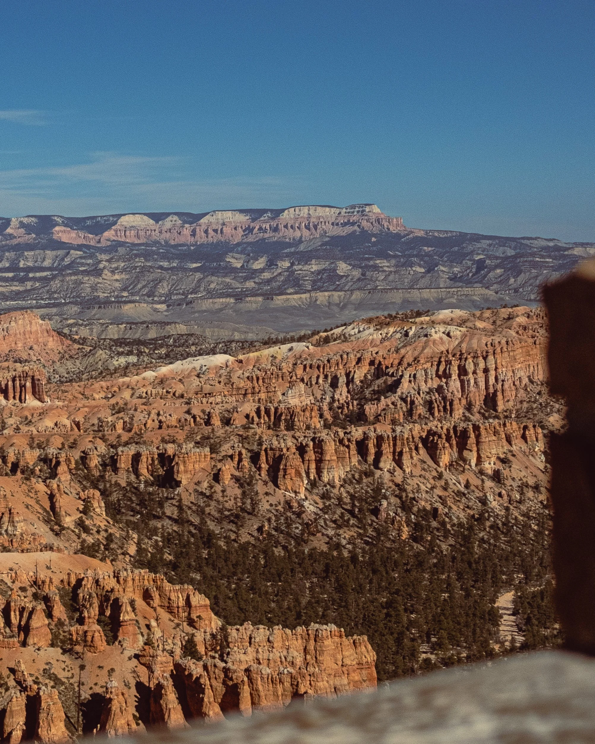 Scenic view of the Grand Canyon with layered rock formations, trees, and distant canyon walls under a clear blue sky.